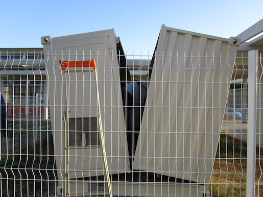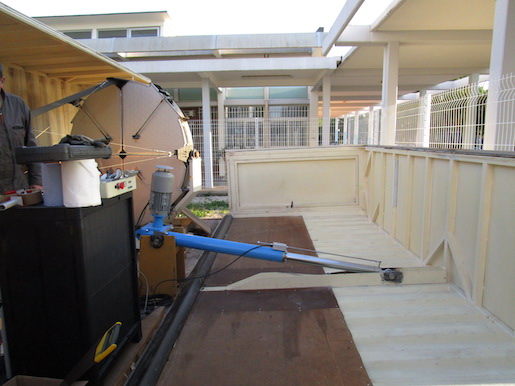 Motorized side walls permit to expose the Raman Lidar structure for data-taking. Equipped with on-line weather alarms it can close down in less than 40 sec, thus protecting the Lidar from most severe weather degradations. Total weight close to 4tn.