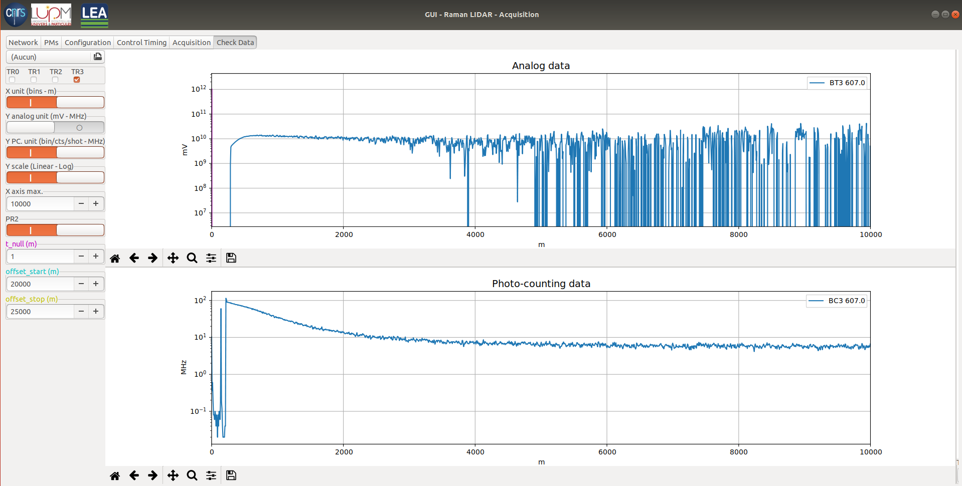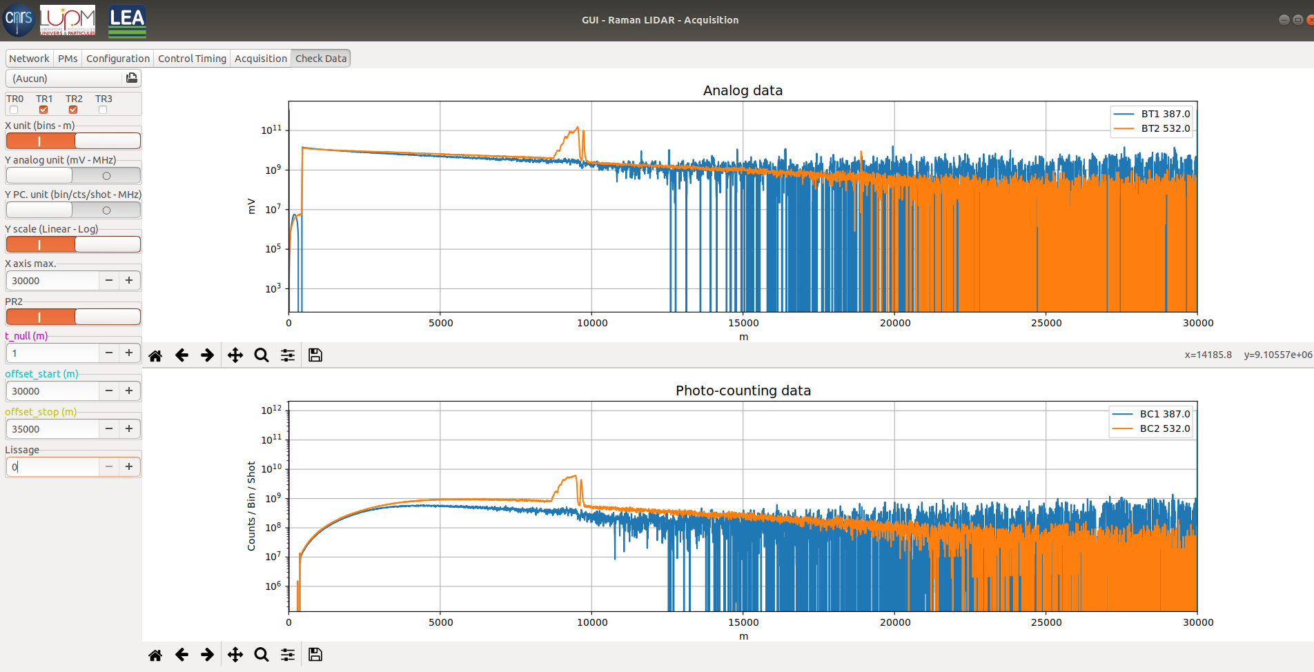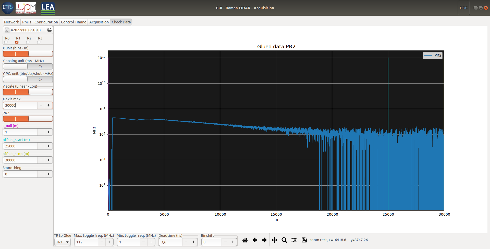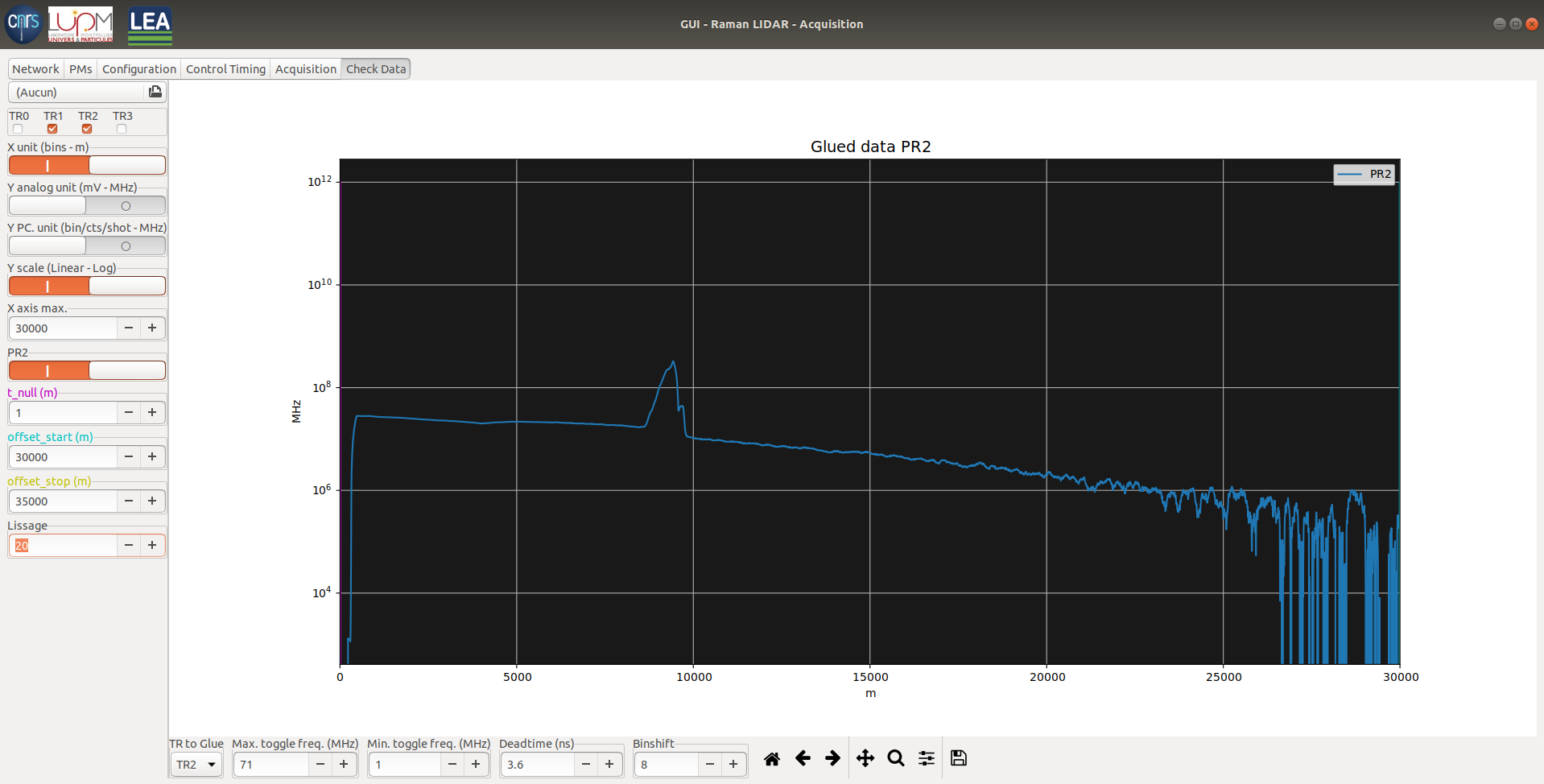 We register data on all four data lines simultaneously, using the analog and current photon mode. Actually using the Licel proposed gluing formula we merge data to get a complete spectrum from as low as 200m and up to few 10nths of km (depending on wavelengh).